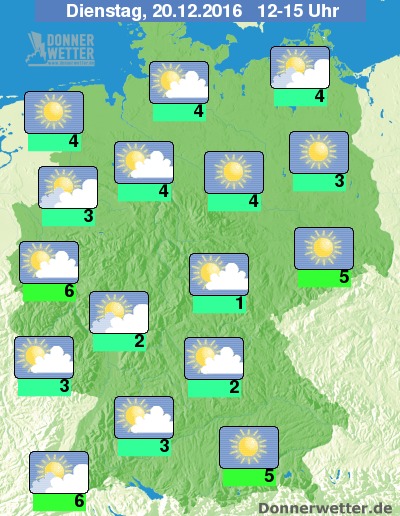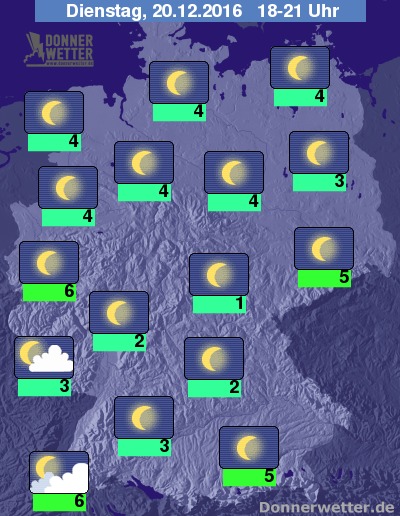 Im Südwesten und gebietsweise auch im Westen können sich auch dichtere Wolken halten können, dabei bleibt es trocken. Die Temperatur erreicht 1 Grad am Thüringer Wald und etwa 6 Grad in der Kölner Bucht.