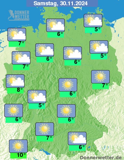 Am Samstag zeigt sich der Himmel über dem Norden und Nordwesten zeitweise wolkig, es bleibt aber meist trocken. In den übrigen Landesteilen ist es nach Nebelauflösung teils heiter, teils sonnig. Vor allem in den Flussniederungen  ist es am Samstag auch anhaltend nebelig-trüb oder hochnebelartig bewölkt.