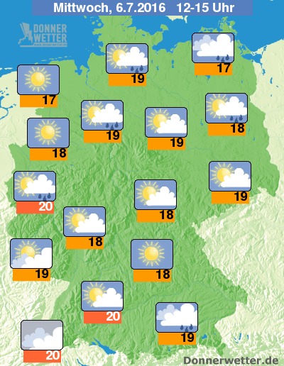 Die Temperaturen erreichen Werte um 17 Grad C in Ostfriesland und um 20 Grad C in Köln.