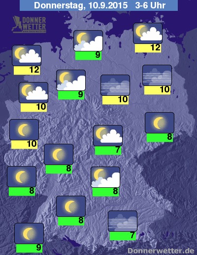 In der kommenden Nacht zeigt sich besonders über der Südhälfte Deutschlands ein oft sternenklarer Himmel, gebietsweise halten sich aber auch einige, teils dichtere Wolken. Weiter nach Norden hin ist die Bewölkung meist locker oder aufgelockert bewölkt. Es bleibt landesweit trocken. Die Temperatur sinkt auf etwa 12 Grad in Rostock und um 7 Grad im Chiemgau. Es bildet sich stellenweise Nebel oder Dunst.