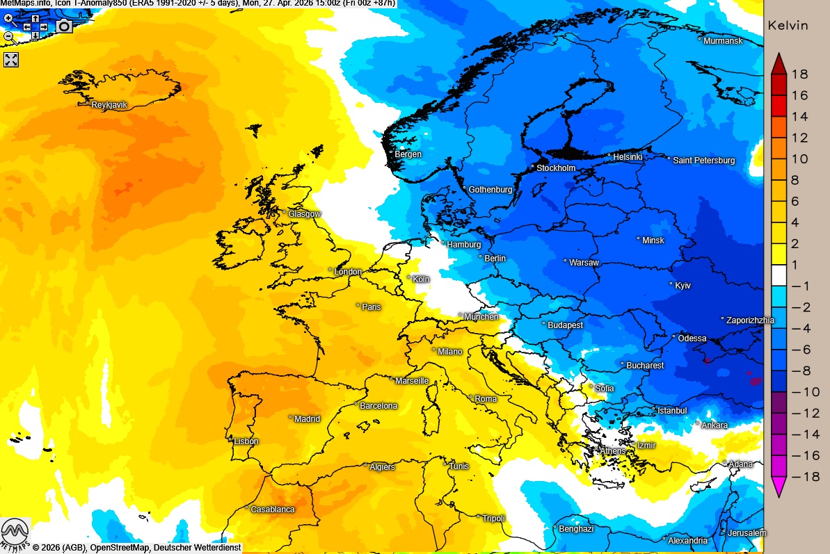 Die Wetterkarte für Montagfrüh (06:00 Uhr), die Lufttemperaturen um 12:00 Uhr sowie die Temperaturabweichung am Montagnachmittag um 15:00 Uhr nach ICON: