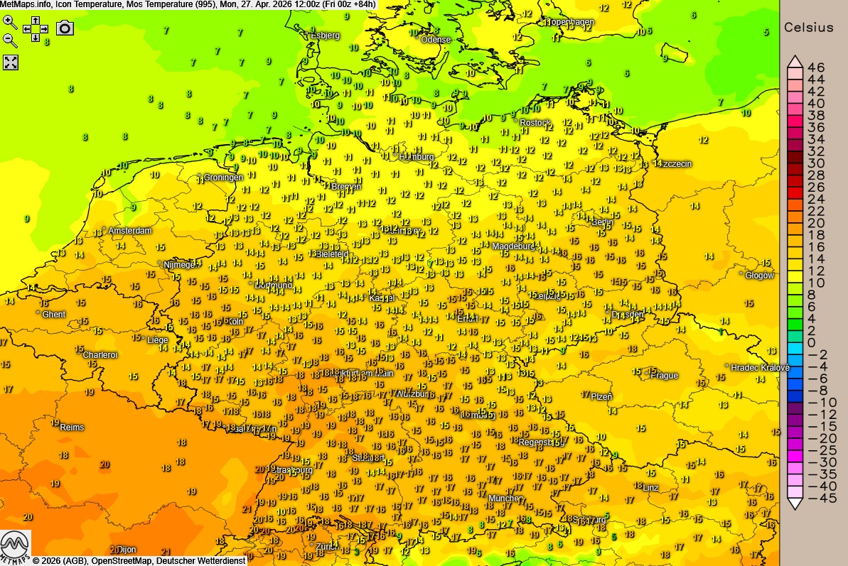 Die Temperaturspanne bleibt dabei beachtlich: Während es an den Küsten bei auflandigem Wind mit rund 10 Grad recht frisch bleibt, klettern die Werte im Norden auf 12 bis 16 Grad. Im restlichen Land wird es mit 17 bis 21 Grad deutlich milder, am Oberrhein sind sogar Spitzenwerte bis zu 23 Grad möglich.