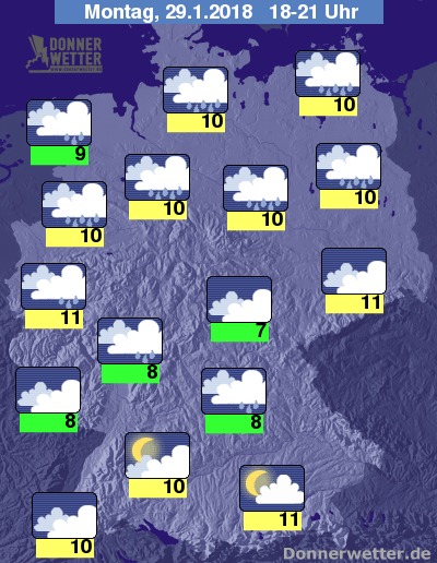 Heute Abend bleibt es über Deutschland meist bedeckt, oft locker bis aufgelockert bewölkt ist es im Alpenvorland und im weiteren Velauf auch im Nordseeumfeld, dazu bleibt es trocken, sonst fällt jedoch besonders über der Nordhälfte immer wieder, teils auch kräftiger Regen. Die Temperatur liegt bei 7 bis 11 Grad.