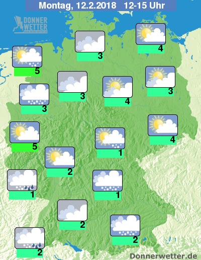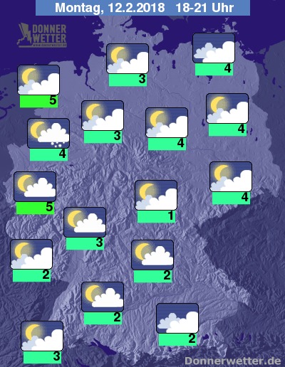 Pünktlich zu den Rosenmontagsumzügen kann sich in den Hochburgen des Karnevals in Köln, Düsseldorf oder Mainz die Sonne häufig durchsetzen und auch die Schneeschauerwahrscheinlichkeit ist hier eher gering. Besonders im Süden, aber auch im Norden bleiben die Wolken eher dicht und bevorzugt am Alpenrand fällt zum Teil auch längeranhaltend Schnee oder Schneeregen, sonst ist es teils locker, teils mal stärker bewölkt, aber meist trocken. Die Temperatur liegt bei 1 bis 5 Grad.