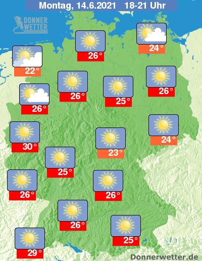 Heute Abend ist es weiterhin verbreitet sonnig, dabei ziehen nur hin und wieder wenige Wolken durch. Bei Höchstwerten von 22 Grad in Wilhelmshaven und bis zu 30 Grad in der Kölner Bucht bleibt es überall trocken.