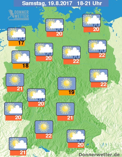 Heute Nachmittag bleibt es über dem Südosten des Landes noch weitgehend wolkenverhangen und regnerisch, sonst scheint jedoch verbreitet die Sonne von einem teils locker bewölktem, teils auch wolkenlosen Himmel. Am Oberrhein sowie am Niederrhein und dem Emsland ziehen gebietsweise dichte Wolken mit einzelnen Schauern auf, sonst bleibt es zunächst trocken. Die Temperatur liegt bei 17 Grad an der Ems und bis 21 Grad in der Lausitz.