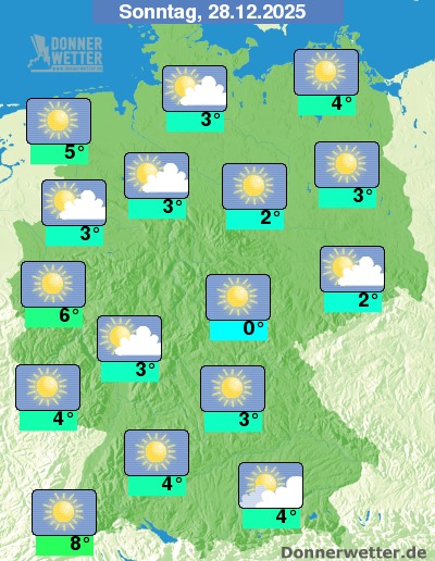 Am Sonntag präsentiert sich das Wetter zumeist heiter oder auch sonnig. Nur stellenweise können sich auch mal einige Wolken halten, dabei bleibt es aber trocken. Die Temperatur erreicht 0 Grad in Jena und bis 8 Grad in Freiburg.