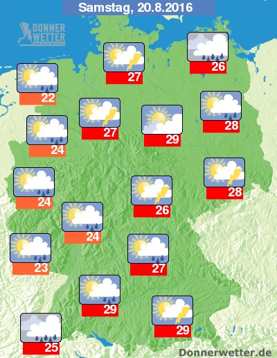 Am Samstag sind zwar immer wieder auch mal Aufheiterungen oder Auflockerungen möglich, oft ziehen aber auch dichte Wolken durch, die für Schauer und auch einzelne Gewitter sorgen. Dazu wird es mit 23 bis 29 Grad oft schwülwarm.