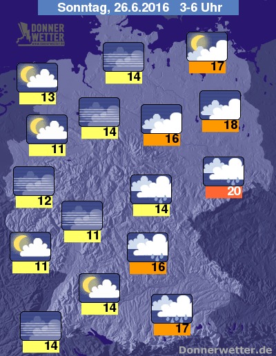 In der folgenden Nacht ist es anfangs verbreitet stark und nur gelegentlich aufgelockert bewölkt, dabei bilden sich immer wieder auch Schauer und örtliche Gewitter. Von Südwesten her lockert der Himmel im Nachtverlauf jedoch immer weiter auf, gegen Morgen ist es über der Südwesthälfte Deutschlands bereits meist locker bewölkt oder sternenklar und dazu trocken. Besonders im Osten und Südosten fällt bei meist dichten Wolken jedoch zeitweise Regen. Die Temperatur sinkt auf 20 Grad in Görlitz und etwa 11 Grad am Niederrhein.