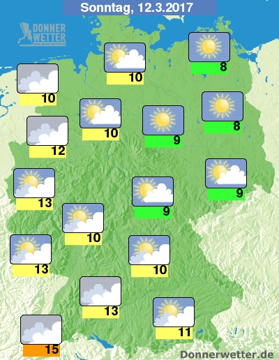 Am Sonntag scheint die Sonne im Norden und Osten der Republik von einem meist wolkenlosen Himmel. Über der Südwesthälfte Deutschlands ist es überwiegend aufgelockert, hier und da aber auch mal stärker bewölkt. Es bleibt landesweit trocken bei Höchstwerten von 8 Grad in Neubrandenburg und bis 15 Grad in Freiburg.