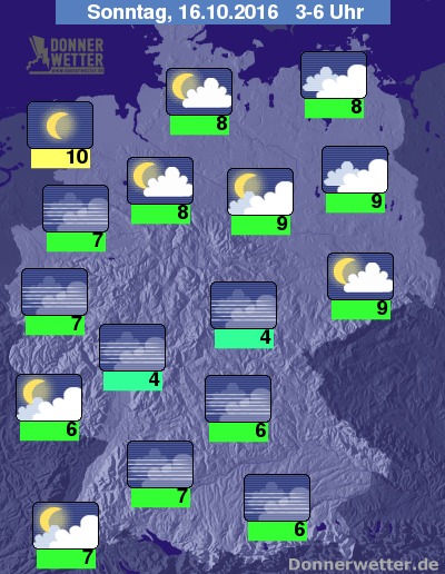 In der bevorstehenden Nacht halten sich über dem Nordosten dichte Wolken aus denen es hier und da etwas regnen kann. Über der Südwesthälfte zeigt sich der Himmel leicht bewölkt oder sternenklar, stellenweise bilden sich Nebel oder Hochnebel. Im übrigen Bundesgebiet ist es meist locker oder aufgelockert bewölkt und dazu trocken. Die Temperatur sinkt auf 10 bis 4 Grad.