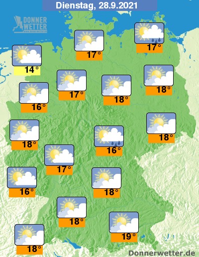 Am Dienstag bleibt es über der Südosthälfte meist stark bewölkt, sonst ist es teils stark, teils wechselnd bewölkt. Über Bayern und Sachsen bilden sich anfangs noch einzelne Schauer, sonst bleibt es im Land weitgehend trocken. Die Temperatur steigt auf 14 Grad an der Nordsee und bis 19 Grad in Berchtesgaden.