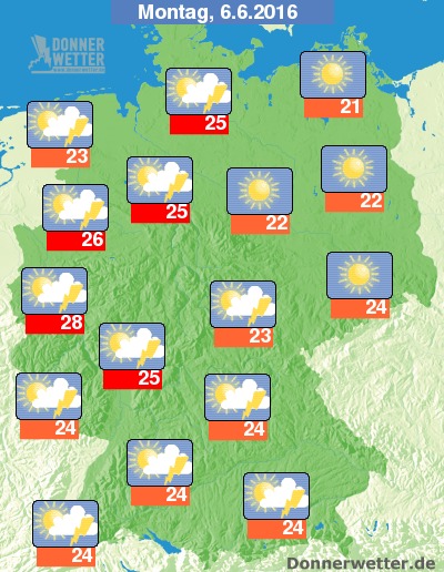 Am Montag ist es in weiten Teilen des Landes heiter oder sonnig, dabei können sich im Tagesverlauf jedoch besonders über der Südwesthälfte hier und da Schauer und örtliche, teils schwere Gewitter entstehen. Weiter nach Nordosten bleibt es hingegen weitgehend sonnig und trocken. Die Temperatur steigt auf 21 bis 28 Grad.