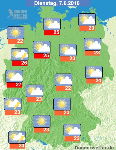 Am Dienstag erwartet uns ein meist freundlicher Tag. In den westlichen und südwestlichen Landesteilen sind neben heiteren Abschnitte jedoch auch dichte Wolken mit möglichen Schauern und lokalen Gewittern möglich, sonst ist es hingegen überwiegend heiter bis sonnig und dazu trocken. Die Temperatur steigt auf 22 bis 27 Grad.