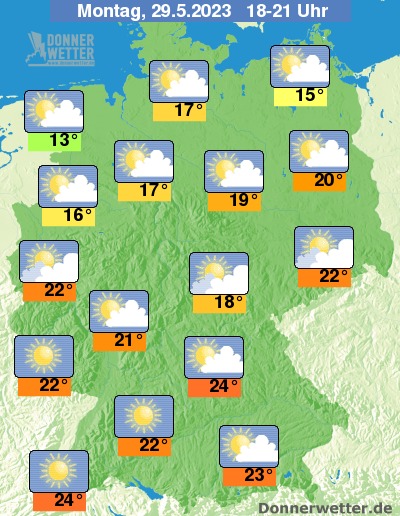 Heute Abend ist es über dem Süden heiter bis sonnig, während weiter nach Norden hin die Sonne meist nicht ungestört scheinen kann, da hier gebietsweise einige, überwiegend jedoch nur lockere Wolken durchziehen. Es bleibt aber überall trocken bei 13 Grad in Bremerhaven und rund 24 Grad in Freiburg.