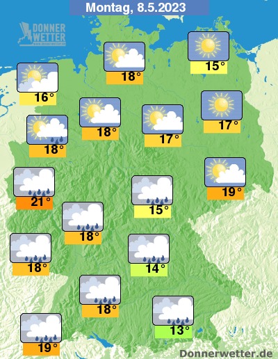 Am Montag ist der Süden und Westen überwiegend wolkenverhangen und es bilden sich auch gebietsweise Schauer. Freundlich zeigt sich das Wetter im Norden und Osten der Republik, hier ziehen meist nur weniger oder lockere Wolken durch und es bleibt trocken. Die Temperatur steigt auf 13 Grad im Berchtesgadener Land und bis 21 Grad im Rheinland.