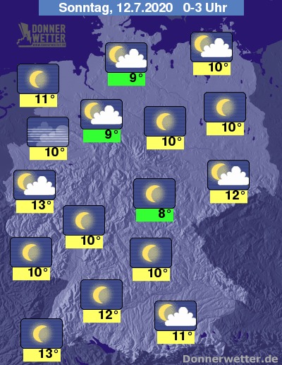In der Nacht auf Sonntag zeigt sich der Himmel zunächst häufig sternenklar oder es ist nur locker bewölkt, in den frühen Morgenstunden kann sich dann vor allem im norddeutschen Tiefland sowie in den südöstlichen Mittelgebirgen verbreitet Nebel bilden. Es bleibt trocken.