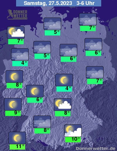 In der folgenden Nacht ist der Himmel über dem Land weitgehend sternenklar. An der Nordsee und im äußeren Südosten sind auch mal einige Wolken möglich, dazu bleibt es trocken. Die Temperatur sinkt auf 11 Grad in Freiburg und etwa 4 Grad in Erfurt.