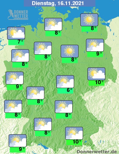 In der Nacht zum Dienstag ziehen über dem Süden des Landes noch meist viele und teils dichte Wolken durch. Im übrigen Bundesgebiet zeigt sich der Himmel verbreitet nur gering bewölkt oder sternenklar, dazu bleibt es trocken. Es bildet sich stellenweise Nebel, dabei besteht die Gefahr von Reifglätte! Die Temperatur sinkt auf 4 Grad im Breisgau und bis -2 Grad im Grabfeld.