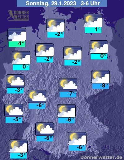 In der Nacht zum Sonntag ist es zunächst häufig locker bis aufgelockert, hier und da stark bewölkt. Im Norden und Nordwesten ziehen im Nachtverlauf kompaktere Wolken auf, die jedoch nur örtlich ein paar Flocken oder Tropfen bringen, ansonst bleibt es trocken. Die Temperatur sinkt auf 4 Grad in Bremerhaven und bis -8 Grad in Chemnitz.