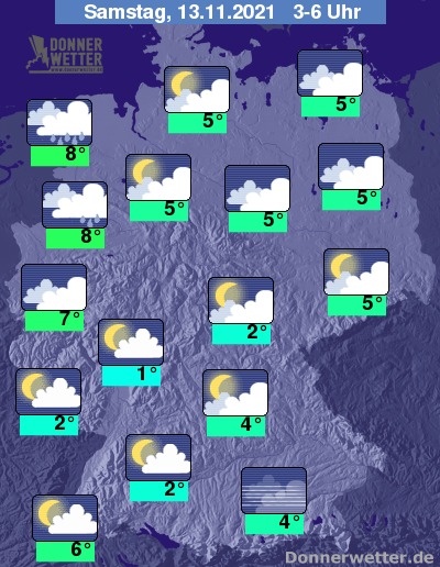 In der Nacht zum Samstag bleibt es im Süden meist locker bewölkt oder sternenklar, sonst ist es schon meist stark und teils noch aufgelockert bewölkt und dazu trocken. Etwa gegen Mitternacht setzt vom Emsland bis zum Niederrhein Regen ein, der sich bis zum Morgen noch ein Stück weiter nach Osten ausdehnt. Die Temperatur sinkt auf 8 Grad an der Ems und bis 1 Grad am Westerwald.