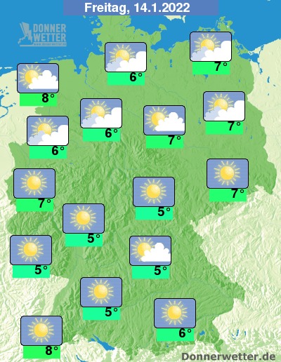 Am Freitag ist es vor allem über der Südhälfte häufig heiter bis sonnig, im Norden ist es hingegen oft stark bewölkt oder trüb, Auflockerungen sind aber auch hier möglich, zudem bleibt es trocken. Die Temperatur steigt auf 5 Grad in Mittelfranken und bis 8 Grad am Oberrhein.
