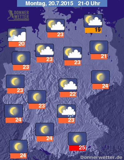 In der Nacht zum Dienstag sind vor allem im Nordosten, gebietsweise aber auch im Westen Deutschlands dichte Wolken unterwegs, die für vereinzelte Schauer sorgen können. Im übrigen Bundesgebiet zeigt sich der Himmel jedoch sternenklar oder nur leicht bewölkt und es bleibt trocken. Die Temperatur sinkt auf 20 Grad in Dresden und bis 14 Grad in Vorpommern.