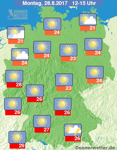 Im Verlaufe des Nachmittags können in Oberbayern örtliche Gewitter auftreten, die sich zum Abend hin weitgehend auflösen. Warme Temperaturen sorgen dort für Schwüle und drückende Luft. Im übrigen Land ist es sonnig mit Höchsttemperaturen um die 30 Grad. Zum Abend hin, bleiben die Temperaturen konstant. Dennoch können vereinzelte Wolkenfelder auftreten. Im Westen bleibt es hingegend Wolkenfrei.