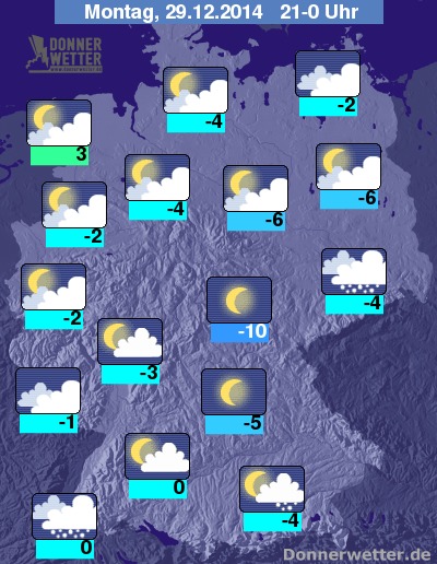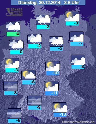 In der Nacht zum Dienstag klingen die Schneefälle am Alpenrand meist rasch ab, sonst ist es zunächst teils aufgelockert, teils aber auch stark bewölkt und weitgehend trocken. Von Norden ziehen im Nachtverlauf jedoch neue dichte Wolken mit Schnee, im Norden und Westen später auch mit Schneeregen und Regen auf, dazu kann es vielfach glatt auf den Straßen werden. Im Osten und Süden des Landes bleibt es bis zum Morgen noch trocken. Die Temperatur sinkt auf 4 Grad in Ostfriesland und auf rund -13 Grad um München.