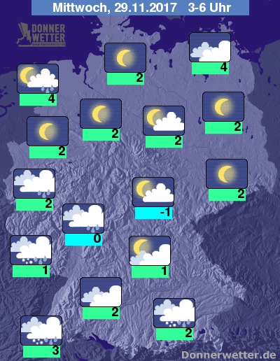 In der Nacht zum Mittwoch halten sich vom Alpenvorland, über Baden-Württemberg bis nach NRW dichte Wolken aus denen gebietsweise Regen, Schneeregen oder Schnee fällt, dabei besteht stellenweise Glättegefahr! Im Nordseeumfeld bringen dichte Wolken gebietsweise etwas Regen, sonst ist der Himmel aber meist leicht bewölkt oder klar und es bleibt trocken. Die Temperatur sinkt auf 4 Grad in Rostock und bis -1 Grad im Eichsfeld.