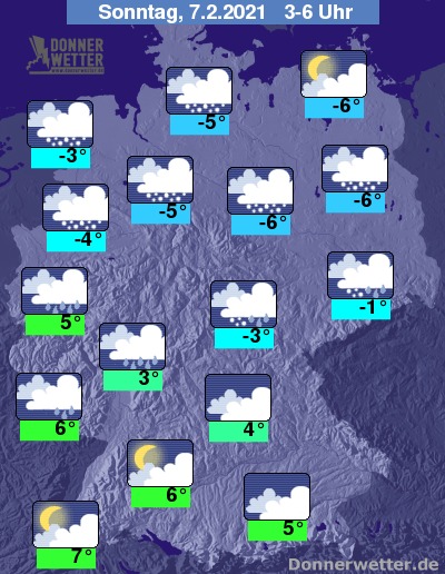 In der Nacht zum Sonntag fällt über der Nordosthälfte Deutschlands verbreitet, teils kräftiger und langanhaltender Schnee, dazu weht hier ein oft starker bis stürmischer Wind. In Nord- und Ostseenähe, sowie auf den Bergen herrscht verbreitet Sturm. Im übrigen Bundesgebiet ist es stark bewölkt, dazu fällt gebietsweise auch Regen. Die Temperatur sinkt auf 7 Grad am Oberrhein und bis -6 Grad im südlichen Brandenburg.