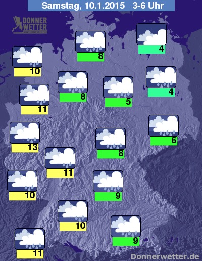 In der Nacht zum Samstag bleibt es weiterhin bedeckt und es fällt zeitweise noch zum Teil kräftiger und langanhaltender Regen, im äußersten Nordosten des Landes bleibt es weitgehend trocken. Die Tiefstwerte liegen bei 13 Grad in der Kölner Bucht und um 4 Grad an der Oder. In Süddeutschland, und hierbei vor allem an den Alpen herrscht verbreitet Sturm, dazu sind oft schwere Sturmböen und vereinzelt auch orkanartige Böen möglich. In den anderen Landesteilen weht ein oft starker, teils auch stürmischer Wind, dabei sind Sturmböen möglich.