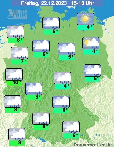 Heute Nachmittag sind im Nordosten längere Aufheiterungen möglich und es bleibt hier meist niederschlagsfrei. In den restlichen Landesteilen ist der Himmel stark bewölkt oder bedeckt und immer wieder muss mit teils schauerartigem Regen gerechnet werden; vor allem in den Staulagen der Mittelgebirge fällt auch ergiebiger Regen. In den hohen Lagen fallen die Niederschlage auch als Schnee (Schneefallgrenze in den östlichen Mittelgebirgen bei 600 m), im Nordosten und Osten sind auch weiße Flocke bis in tiefe Lagen möglich.