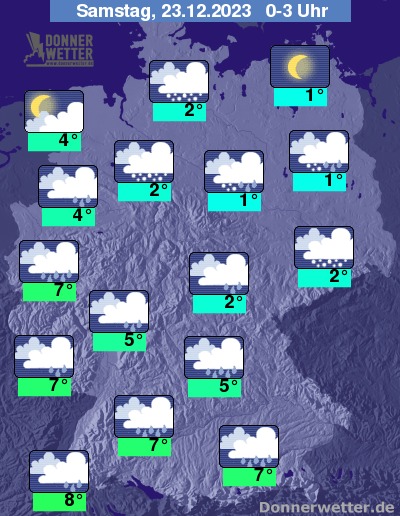 In den östlichen Mittelgebirgen sinkt die Schneefallgrenze in der Nacht auf 300 bis 500 m, an den Alpen um 1.000 m. Im Nordosten fallen Schneeschauer auch bis in tiefe Lagen. Im Südwesten legt der Wind in der Nacht erneut zu, verbreitet muss hier dann mit stürmischen Böen, im Süden auch Sturmböen gerechnet werden.