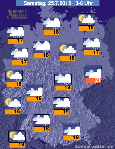 Am Samstag kann sich vor allem im Süden zwischen den Wolken häufig die Sonne zeigen, hier sind gebietsweise aber auch Schauer möglich, sonst ist es überwiegend stark oder wechselnd bewölkt und es bilden sich zum Teil kräftige Schauer und besonders in den Küstengebieten sowie im Osten des Landes auch einzelne Gewitter. Die Temperatur steigt auf kühle 17 Grad am Westerwald und bis auf schwülwarme 28 Grad in Dresden. Der Wind weht dabei zunehmend stark bis stürmisch, im Norden und Westen herrscht zum Teil sogar Sturm, dabei sind schwere Sturmböen möglich.