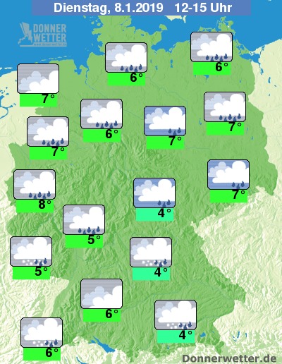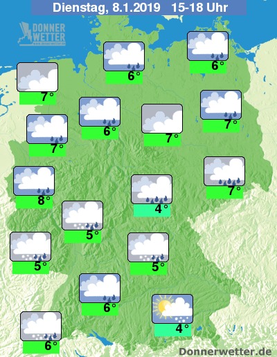 Am Nachmittag bleibt es abgesehen von wenigen Aufhellungen dicht bewölkt und zeit- und gebietsweise fällt zum Teil schauerartiger Regen. In höheren Lagen Süddeutschlands fällt auch Schnee.