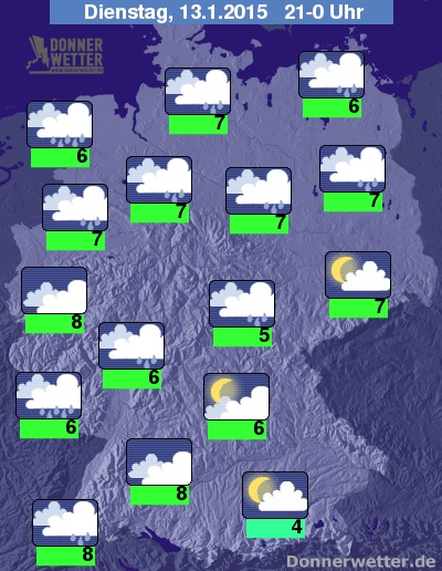 Heute Abend ist es im Südosten des Landes, sowie in Teilen Sachsens noch oft aufgelockert bewölkt und weitgehend trocken, in den anderen Landesteilen ist es dagegen verbreitet stark oder dicht bewölkt und es fällt zeitweise Regen. Die Abendtemperatur liegt bei 8 Grad in der Kölner Bucht und um 4 Grad in Oberbayern. Es weht ein verbreitet frischer bis starker und in Böen stürmischer Wind, dabei sind auch Sturmböen möglich.