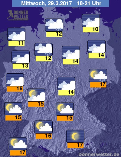 Am Abendeinbruch stillt der Regen zeitweise an der Ost- und Nordseeküste. Die Südhälfte Deutschlands bleibt weiterhin von Regenfall verschohnt und verbleibt zunächst trocken. In der Sächsichen Schweiz könnte es am Abend zu einzelnen Schauer kommen. Die Höchsttemperaturen liegen weiterhin bei Werten um 17 Grad C.