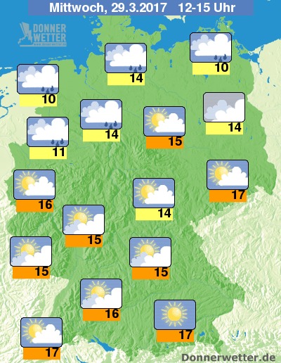 Am heutigen Nachmittag zeigt sich das Wetter in der Südhälfte Deutschlands mild und trocken. Die Nordhälfte zeigt sich vom Gegenteil, eher nass und feucht. Schauer und Wolken sind also am Nachmittag im Norden Deutschlands im Himmel. Die Höchsttemperaturen liegen bei Werten um 17 Grad C am Schwarzwald.