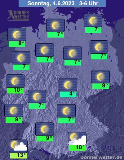 In der bevorstehenden Nacht ist es über dem Land verbreitet sternenklar. Im Alpenvorland hält sich hingegen oft wechselnde bis starke Bewölkung, dazu bleibt es aber ebenfalls trocken. Die Tiefstwerte liegen bei 13 Grad am Oberrhein und 4 Grad im Vogtland.