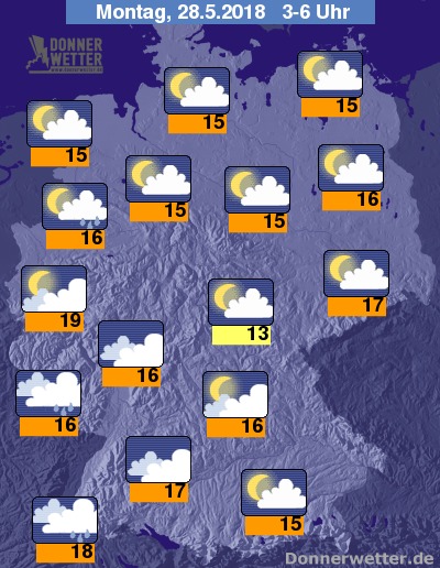 Am Montag ist es zunächst verbreitet heiter bis sonnig und trocken, im Südwesten sind jedoch bereits am Vormittag Schauer und örtliche Gewitter möglich. Im weiteren Tagesverlauf steigt auch das Gewitterrisiko über dem Süden und Westen. Im Norden und Osten bleiben Schauer und Gewitter seltener, hier scheint überwiegend die Sonne bei meist nur geringer Bewölkung. Die Temperatur steigt auf 24 Grad in Stralsund und bis 31 Grad in Köln.