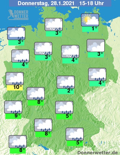 Bis zum frühen Abend regnet es munter weiter, so dass Bäche und kleinere Flüsse im Süden und Westen in Verbindung mit der Schneeschmelze deutlich anschwellen. Über dem südlichen Niedersachen und den nördlichen Mittelgebirgen fällt zum Teil Schnee oder Schneeregen.
