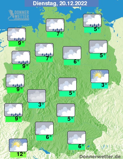 Heute ist es überwiegend trüb oder bedeckt, im Süden und über Sachsen ist hier und da etwas Sonne möglich. Über der Nordwesthälfte der Republik fällt gebietsweise Regen, während es im übrigen Land weitgehend trocken bleibt. Die Temperatur steigt auf 3 Grad am Westerwald und bis 12 Grad am Oberrhein.