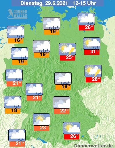 Heute Nachmittag ist es teils dicht, teils aufgelockert bewölkt, dabei können sich wiederholt Schauer und auch örtliche Gewitter entwickeln. Die Temperatur liegt bei 16 Grad an der Nordsee und bis zu 31 Grad in Berlin.