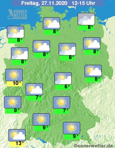 Die Temperaturen bewegen sich allgemein zwischen 5 und 10 Grad, im Breisgau kann es mit sonniger Unterstützung stellenweise bis zu 13 Grad mild werden. Im dichten Einheitsgrau halten sich die Werte aber meist unterhalb der 5 Grad - Marke.
