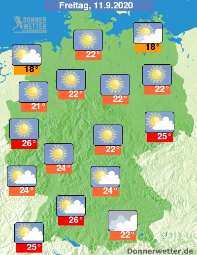 Die Höchsttemperaturen liegen zwischen gemäßigten 18 bis 23 Grad im Norden, sowie in den Mittelgebirgen und an den Alpen. In den anderen Gebieten werden spätsommerliche 24 bis 27 Grad erreicht.