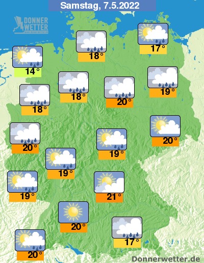Am Samstag ist es zunächst verbreitet wechselnd bis stark bewölkt, im Süden hier und da auch heiter bis sonnig, dabei bilden sich gebietsweise Schauer. Am Nachmittag heitert es im Norden verbreitet auf und oft wird es auch sonnig, dabei bleibt es trocken. Die Temperatur steigt auf 14 Grad an der Nordsee und bis 21 Grad in Unterfranken.
