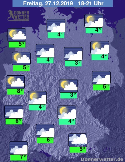 Am Abend fällt im Alpenvorland zum Teil noch Niederschlag, im Tiefland als Regen, im Hochland häufig als Schnee. Sonst präsentiert sich der Himmel in Deutschland teilweise wolkenverhangen, teilweise aufgeklart.