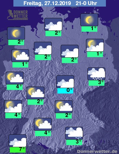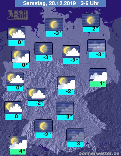 Bis zu den Frühstunden kühlt die Luft meist in den Frostbereich von -4 bis 0 Grad ab. Dabei besteht die Gefahr durch überfrierende Nässe oder Reifglätte. Nur in Teilen von Sachsen, sowie im Breisgau bleiben die Temperaturen eher im positiven Bereich zwischen 0 und 4 Grad.