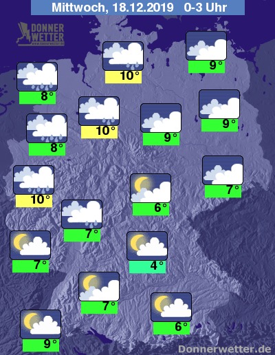 In der Nacht bleibt der Himmel über dem Norden, Westen und anfangs auch noch im Osten Deutschlands bedeckt. Vor allem in der Nordwesthälfte muss dabei immer wieder mit Regen gerechnet werden. Im Südteil des Landes ist der Himmel teils locker, teils aufgelockert bewölkt und es bleibt meist trocken.